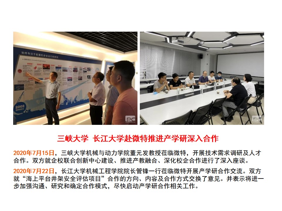 在這特殊的一年里,微特人攻堅(jiān)克難完成全球規(guī)模最大、技術(shù)難度最高的三峽升船機(jī)的閘首橋機(jī)可靠性提高項(xiàng)目,為三峽升船機(jī)順利復(fù)航提供保障;微特人敢為人先承接定制化攀鋼起重機(jī)智能運(yùn)維系統(tǒng)、振華重工卸船機(jī)稱重系統(tǒng)等重大項(xiàng)目,貼身為一流鋼鐵船舶企業(yè)服務(wù);微特人開拓進(jìn)取與中水七局、中建四局等企業(yè)合作研發(fā)起重機(jī)運(yùn)行關(guān)鍵技術(shù)項(xiàng)目取得重大突破;微特人勤勉努力不斷深化與全球最大石油生產(chǎn)公司沙特 Aramco、全球頂級起重機(jī)品牌DEMAG、Liebherr之間的合作,成果豐碩。